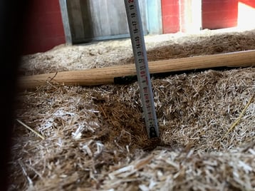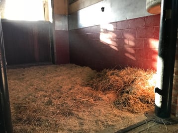 Die gründlich gesäuberte Einstellbox (12 m²) mit ca. 100 kg Flachseinstreu (d.h. 8 kg/m²) Grundeinstreuen.