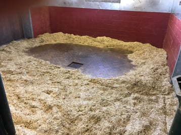 Die gründlich gesäuberte Einstellbox (12 m²) mit ca. 100 kg Flachseinstreu (d.h. 8 kg/m²) Grundeinstreuen.
